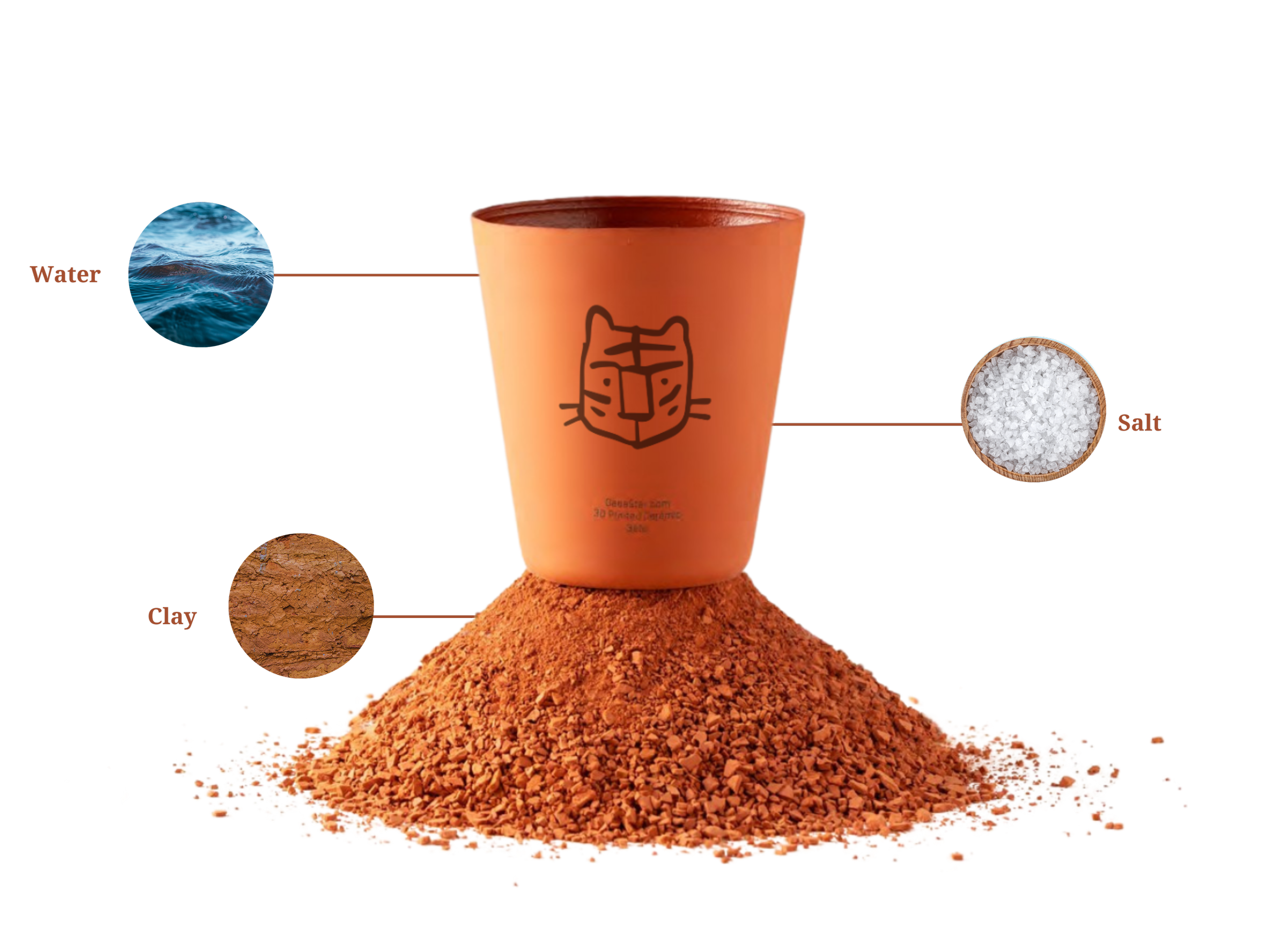 Clay cups are sustainably 3D printed with natural ingredients only : Clay, Water, Salt and coated with natural Mineral Glaze.